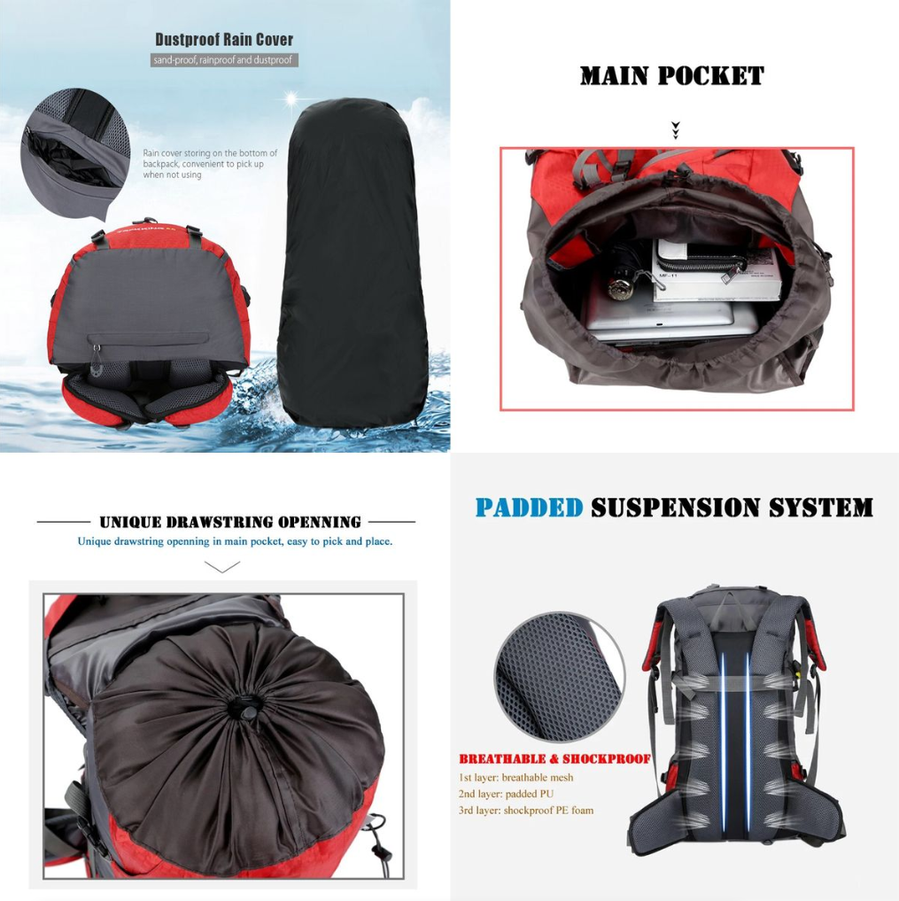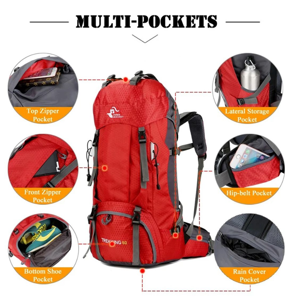60L Water Resistant Camping Backpack With Rain Cover-Red