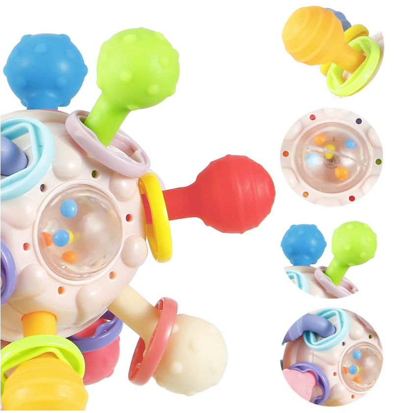 Multi sensory Clutching Baby Toy:The atomic rattle & teether multi-sensory clutching rattle and teether encourages grasping and reaching which are important in gross motor skills development.