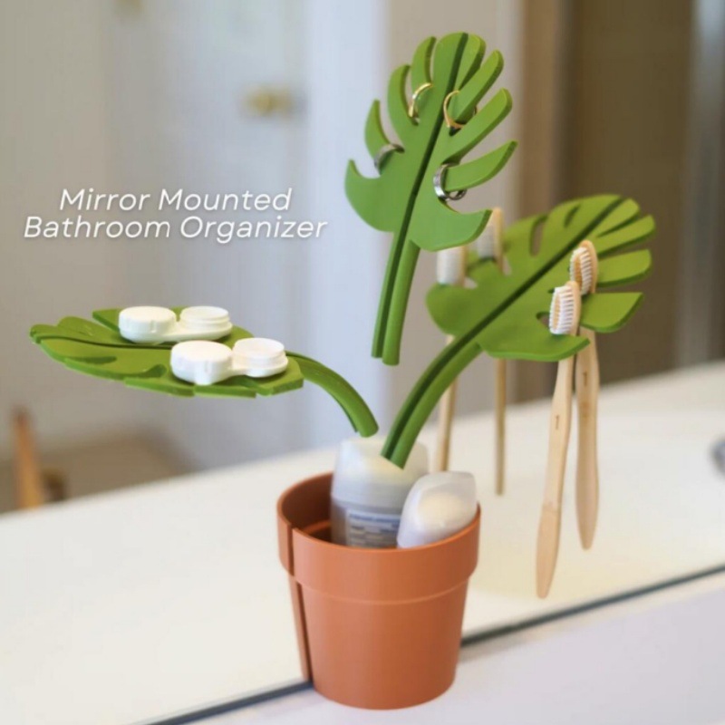 Mirror Monstera Toothbrush Holder No-Drill Wall-Mounted Bathroom Organizer