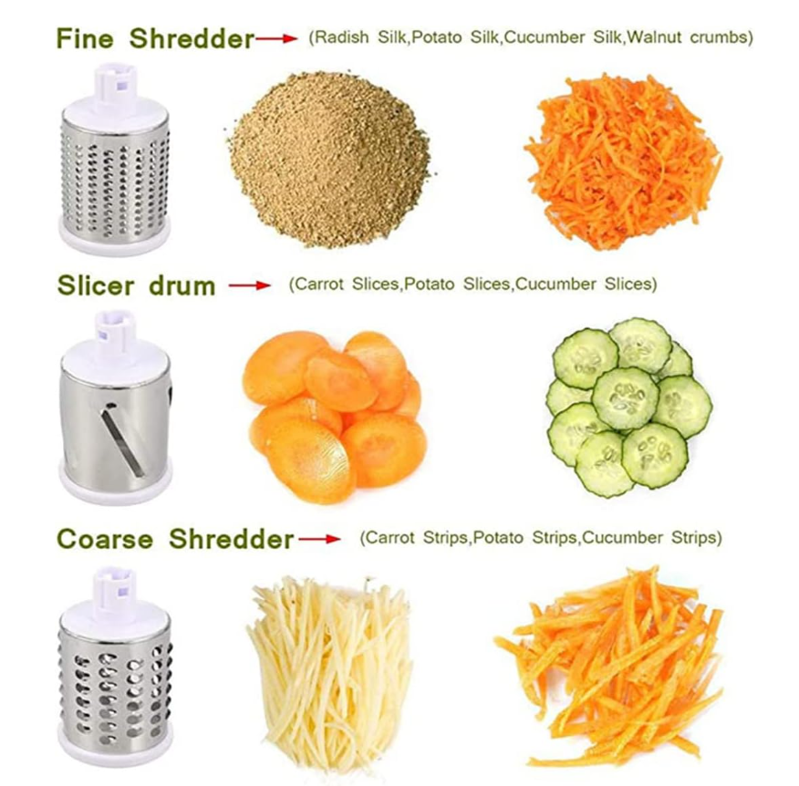 Multi-Functional Design: Features 3 interchangeable stainless steel drums for slicing, grating, and shredding vegetables, fruits, cheese, and more—perfect for salads, pizzas, and more.