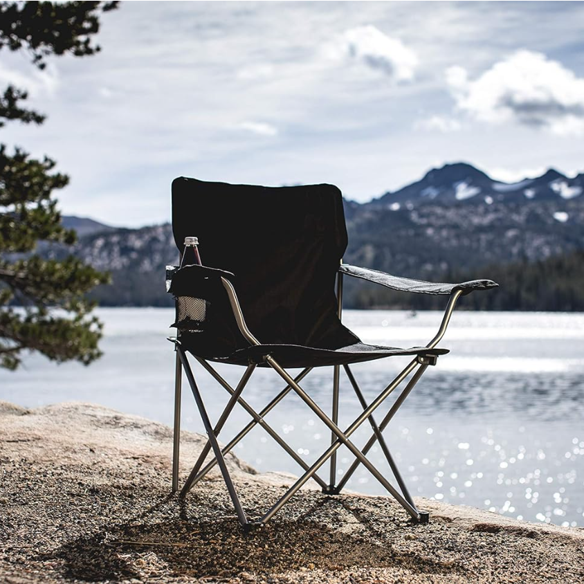 Beach Chair Beauty:With extra long armrests, a mesh cup holder, and a natural recline this camping chair is seriously comfy. Made of a durable 600 D Oxford cloth on a steel frame, this lawn chair’s built to last