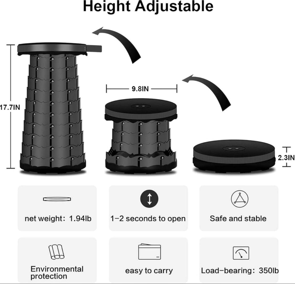 Wide Range of Uses: This telescopic stool is perfect for both indoor and outdoor use. Indoor scenes include the living room, bedroom, bathroom, kitchen, and office; outdoor activities include camping, fishing, hunting, hiking, BBQs, picnics, cooking, gardening, and more.