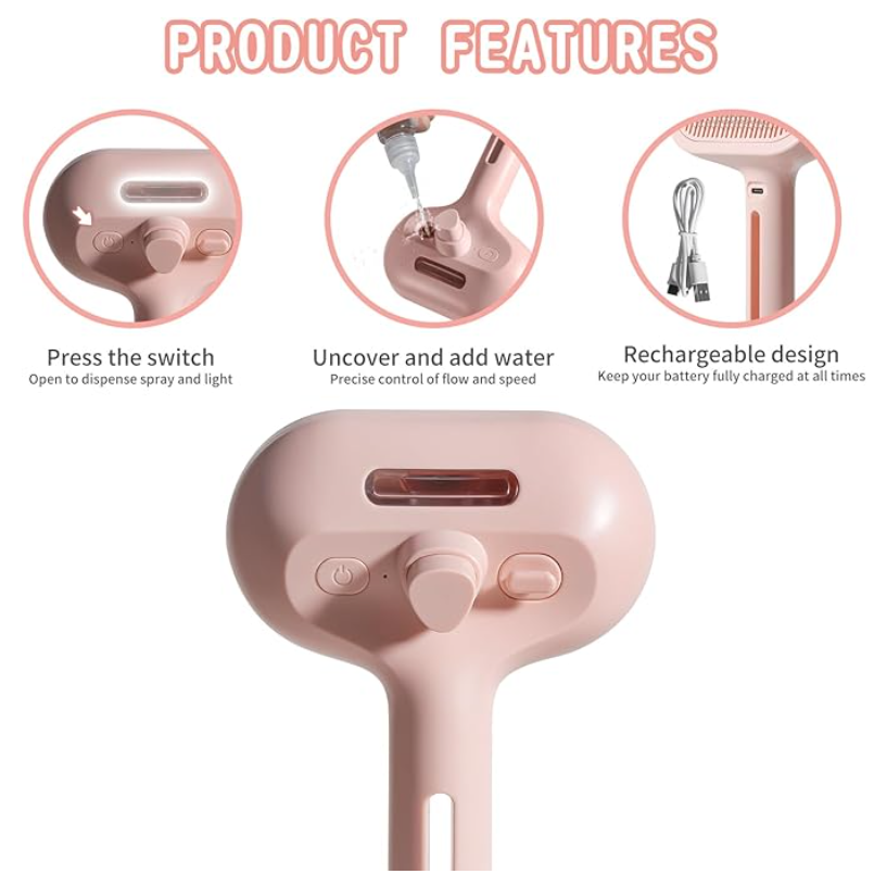 2-in-1 Spray & Grooming Design: Features a built-in water tank that allows for gentle misting during grooming to reduce static and flying hair—perfect for both cats and dogs.