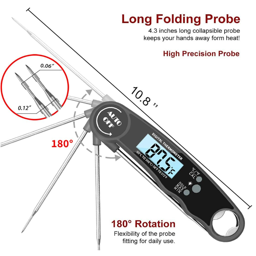 Smart, Easy-to-Use Design: The foldable 4.6″ stainless steel probe automatically powers on/off. Just flip it open to start measuring and fold it back to turn off. Auto shut-off after 10 minutes helps conserve battery.
